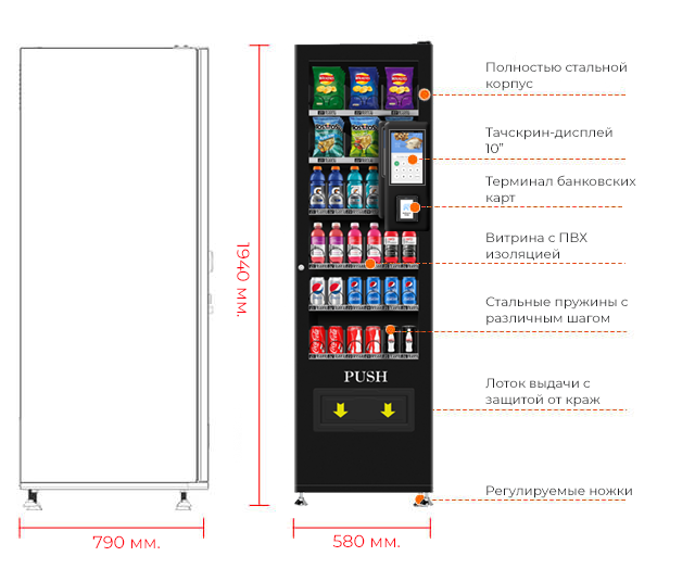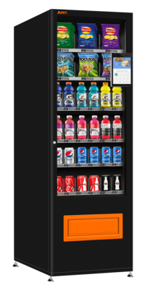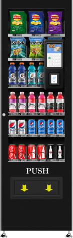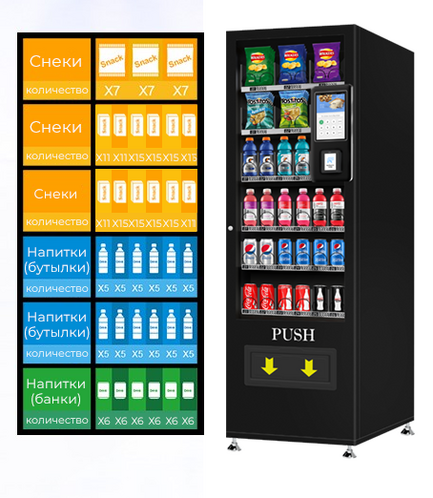 Самый компактный автомат с загрузкой до 500 единиц продукции -прохладительных напитков, снеков, шоколада, сэндвичей, выпечки.